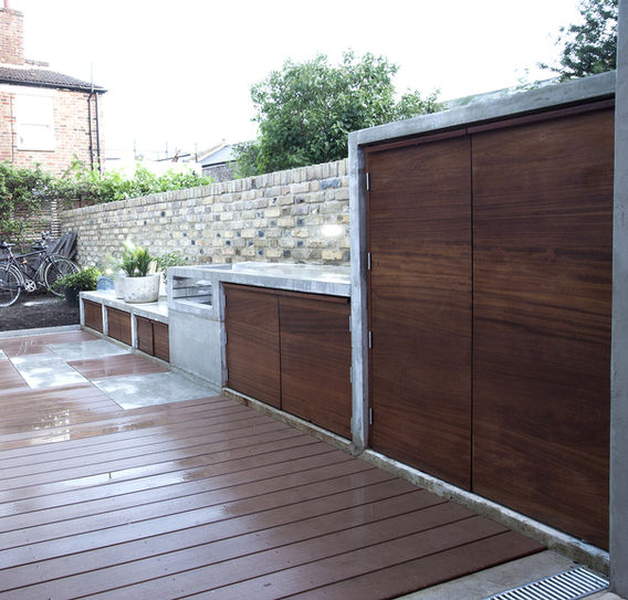 It involved an extension to the back of a traditional Georgian terraced house. The main idea was to have all the internal concrete lines connecting with the external concrete lines, from work surfaces, to flooring, decking and hard landscaping. We worked with joiner Nick M'Cawley, reusing our formwork to cast in place everything in White Portland cement. We upcycled the Oroco woodwork from science desks purchased from a nearby school. The decking is made from sawdust and recycled plastic.