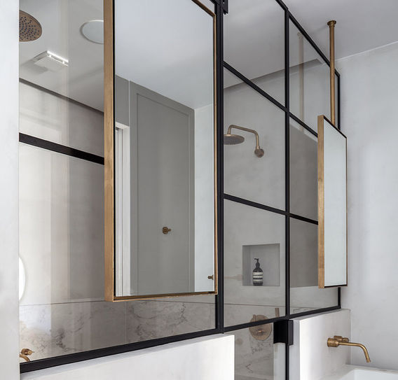 The half-height walls create a division between the vanity area and the wet room. These were built with cement fibre board, rendered with Microcement, as were the shower enclaves and window sills, allowing the client space for toiletry items.